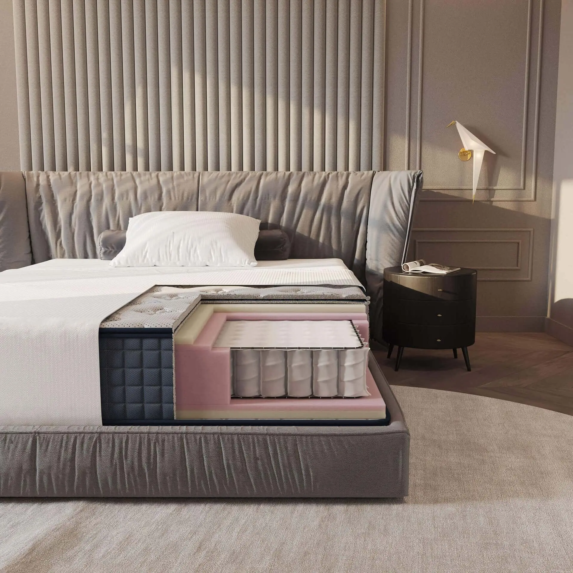 Notre modèle de matelas à ressorts ensachés est conçu pour toutes les positions de sommeil, offrant un environnement idéal pour le repos et un soutien adéquat de la colonne vertébrale. Environ 1000 ressorts (pour un matelas double) assurent un confort optimal tout au long de la nuit.